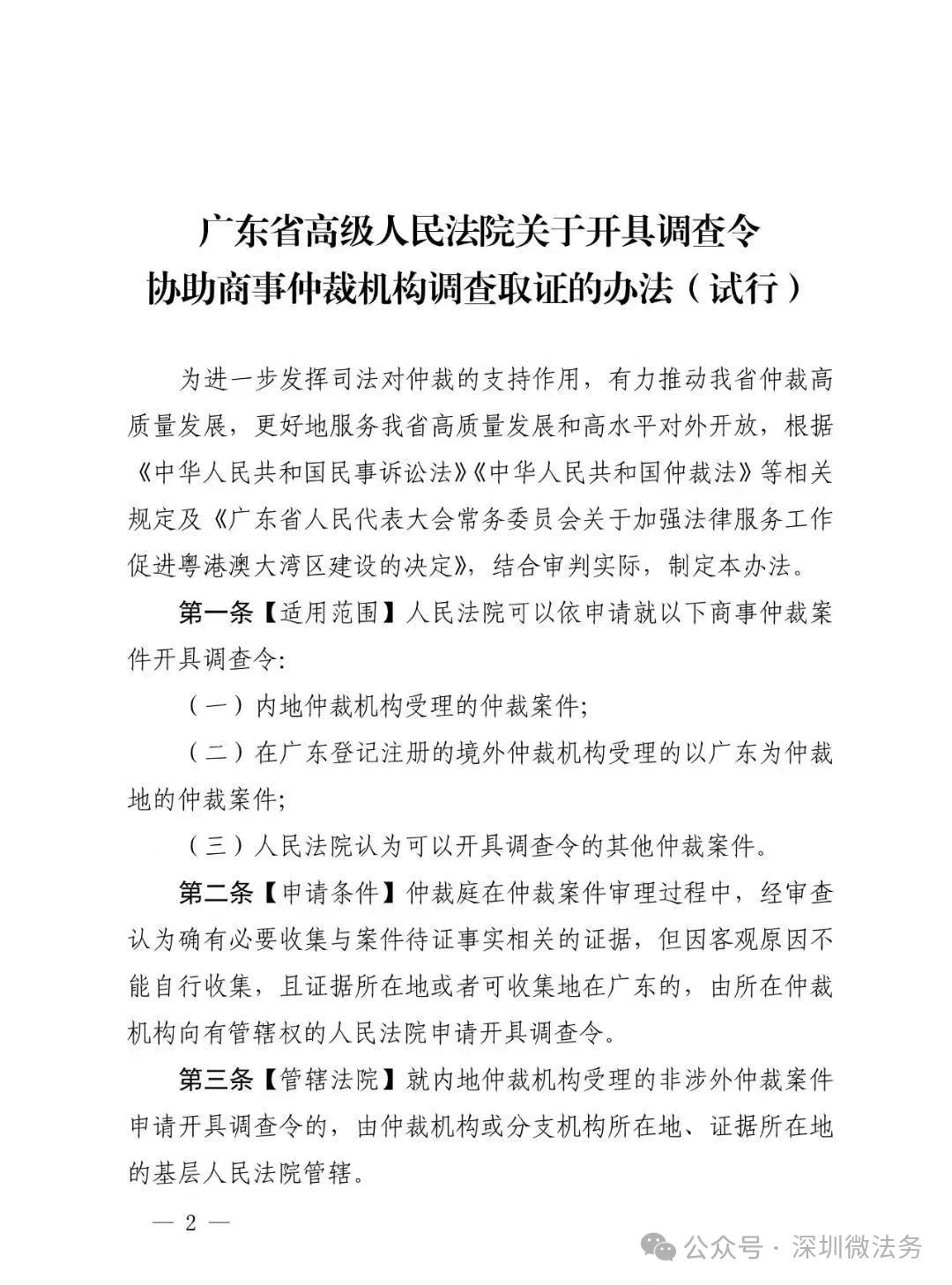 第二條【申請條件】仲裁庭在仲裁案件審理過程中,經審查認為確有必要收集與案件待證事實相關的證據,但因客觀原因不能自行收集,且證據所在地或者可收集地在廣東的,由所在仲裁機構向有管轄權的人民法院申請開具調查令、