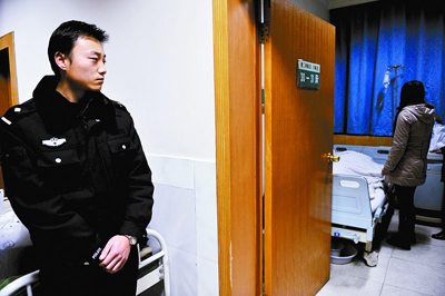 昨日,重傷的王煜棟在醫院治療,一位同事站在門外表情凝重 本報記者李杰 攝